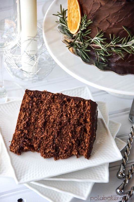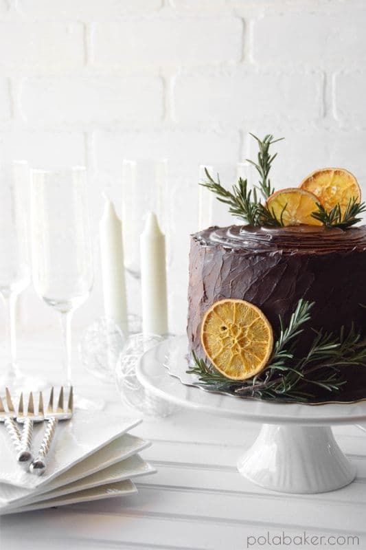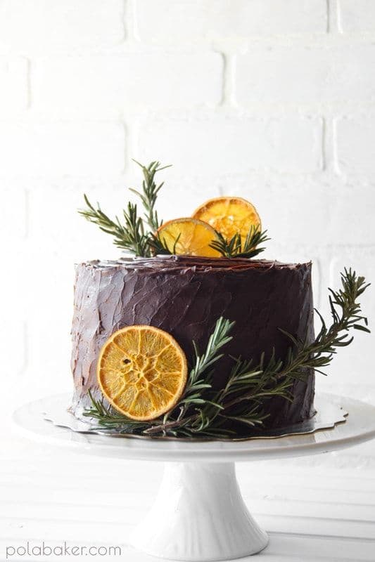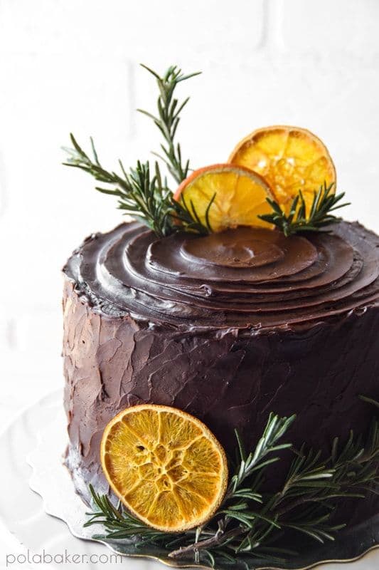 - To assemble the cake, spread ganache on a first layer. Then soak the second layer with orange jam. Third layer – ganache. Fourth – orange jam. And fifth layer – ganache. Spread the rest of ganache on top and the sides of the cake. Decorate with dried oranges and rosemary sprigs.