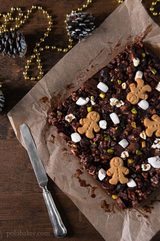 - Add dried fruit, nuts, crushed cookies, wafers, popcorn and mini marshmallows to the bowl and mix well until everything is coated in chocolate. Transfer the mixture to the pan and spread it out to the corners. Chill in the fridge for at least 2 hours. Then cut it into squares and enjoy!