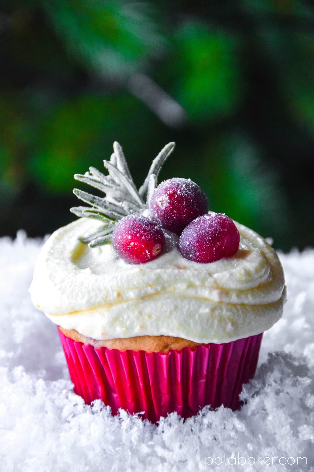 - Spread or pipe cream on top of each cupcake and decorate with frosted cranberries and rosemary.