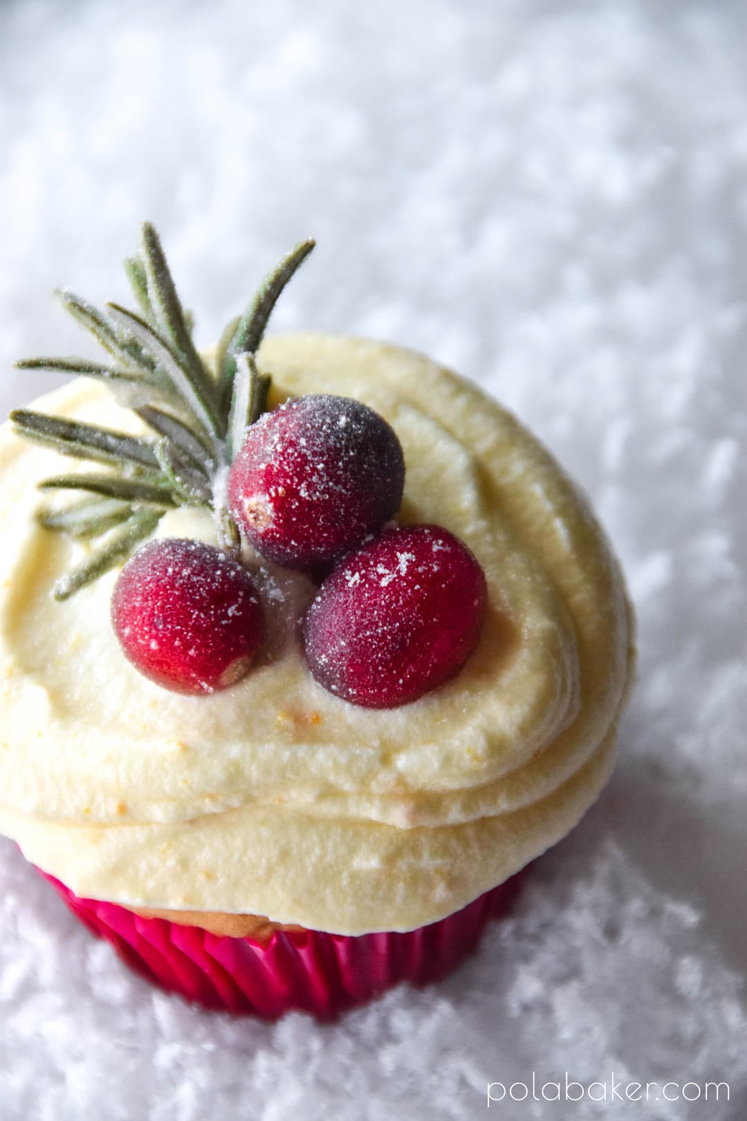 Decorate these cupcakes with frosted cranberries and rosemary sprigs. Find out how to make frosted cranberries (and rosemary).