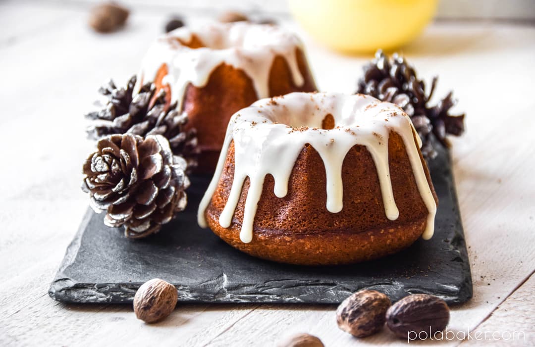 - For the glaze mix powdered sugar with eggnog and pour over the tops of cooled bundt cakes. Sprinkle with a pinch of grated nutmeg.