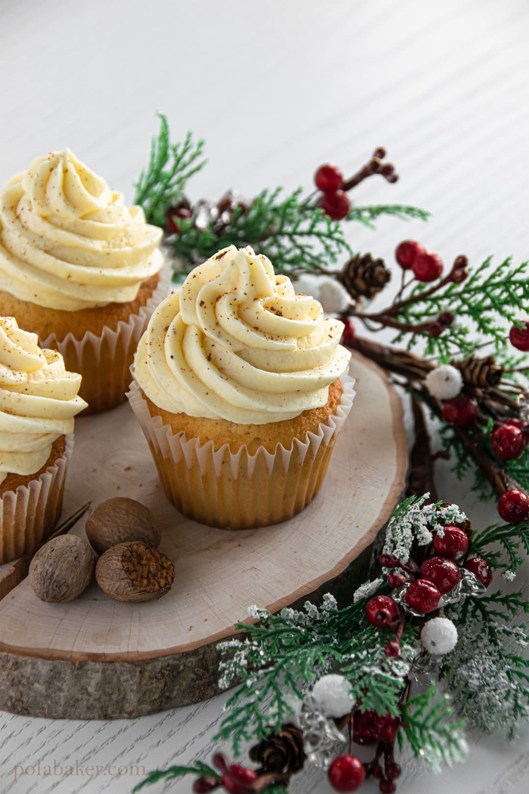 - For the frosting, beat butter with sifted icing sugar until smooth, then add eggnog gradually while mixing. Add alcohol if using. Put the frosting in a piping bag fitted with a large star nozzle and pipe on top of each cupcake. Make sure the cupcakes are cooled before frosting them! Sprinkle with freshly grated nutmeg (just a tiny bit, don’t put too much).