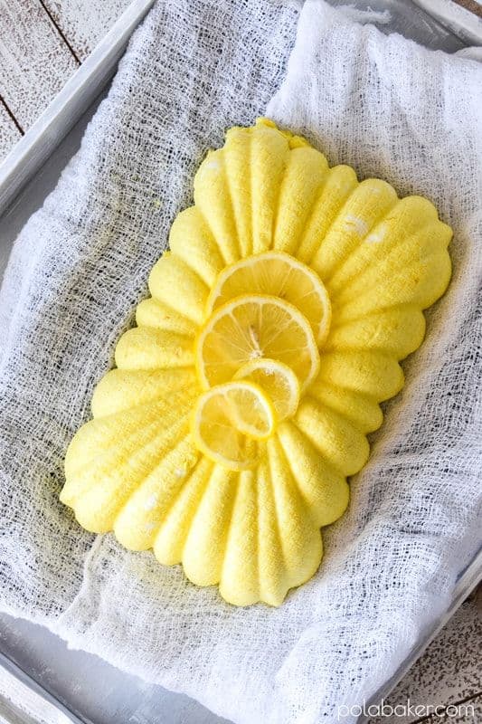 - Line the mould of your choice with dampened cheesecloth. Spread an even layer of lemon batter (use all of it) around the sides and the bottom of the mould. Fill the middle with poppy seed batter.