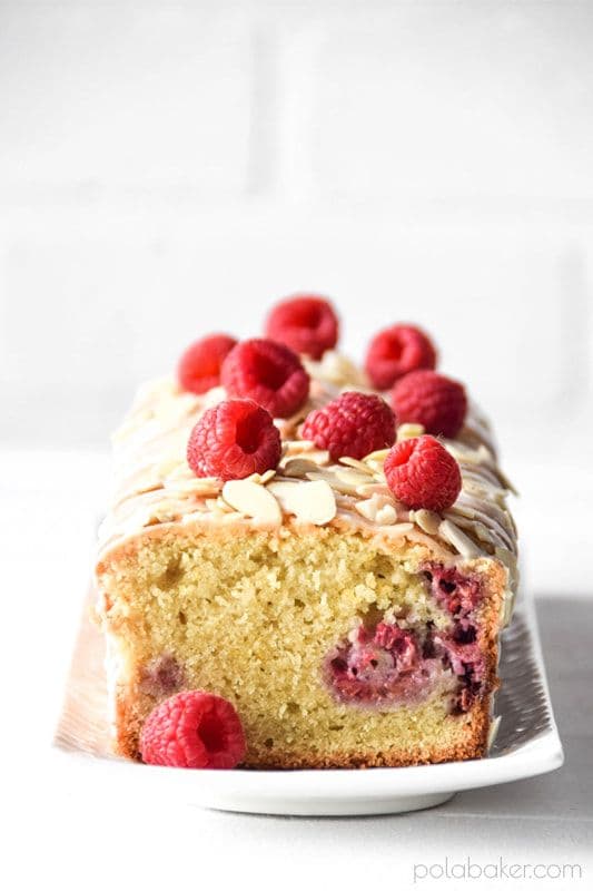 - Drizzle the glaze over the loaf and sprinkle with almond flakes and raspberries.