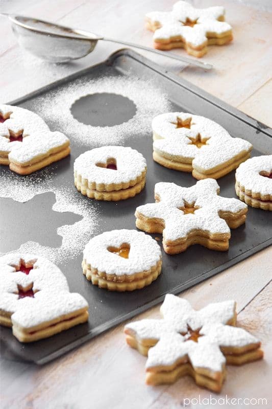 - Spread 1/2-1 tsp of jam on each whole cookie, top it with a second cookie (the one with the “window”) and dust with a thick layer of icing sugar.