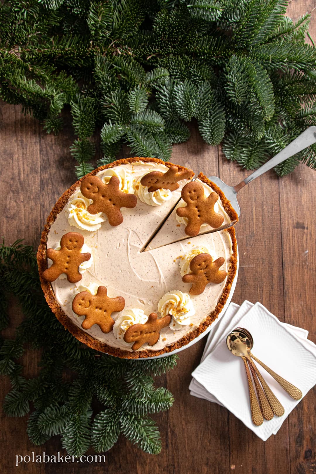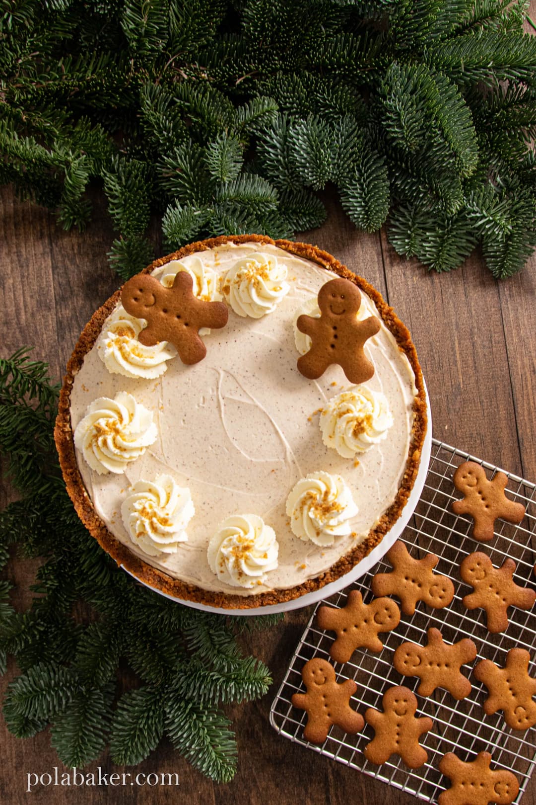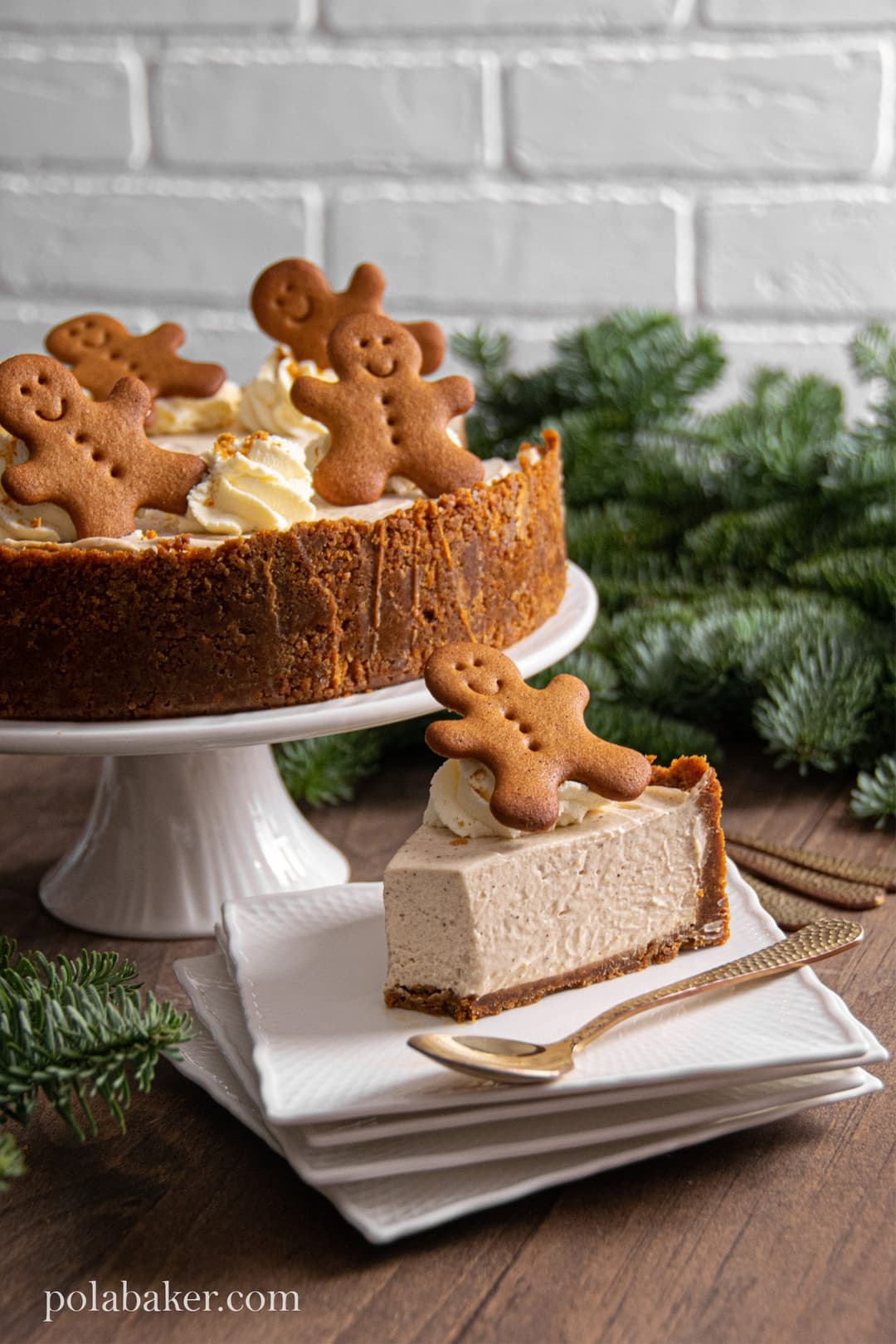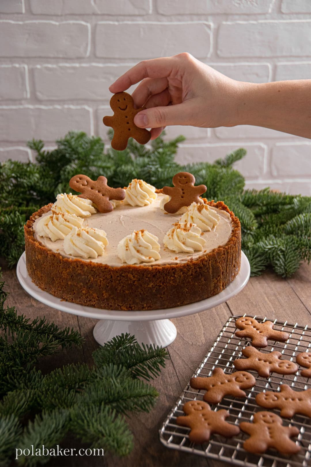 - Before serving carefully remove the cheesecake from the springform and transfer on a serving plate. Whip cream with icing sugar and pipe on top of cheesecake. Decorate with gingerbread cookies.