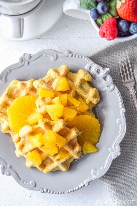 But don’t worry, they’re still delicious and sweet! The sweetness comes from the sauce, which is basically maple syrup (if it’s a real one, then it doesn’t have any added sugar in it) and oranges. This sauce is so good, that you can use it not only with these waffles but also with pancakes and French toasts.