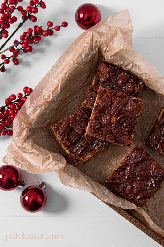 Today’s recipe is also my first. I always get pecan pies and slices in coffee shops, when I crave some dessert alongside my coffee. But I never made one at home until now. So here it goes – my first pecan pie. In a shape of bars.
