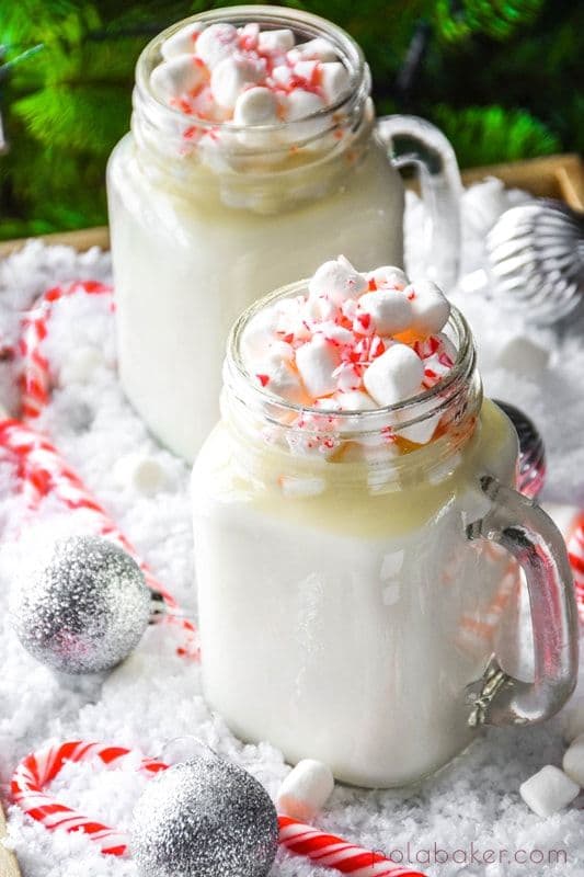 - Pour the drink into cups and top with mini marshmallows and crushed peppermint candy.