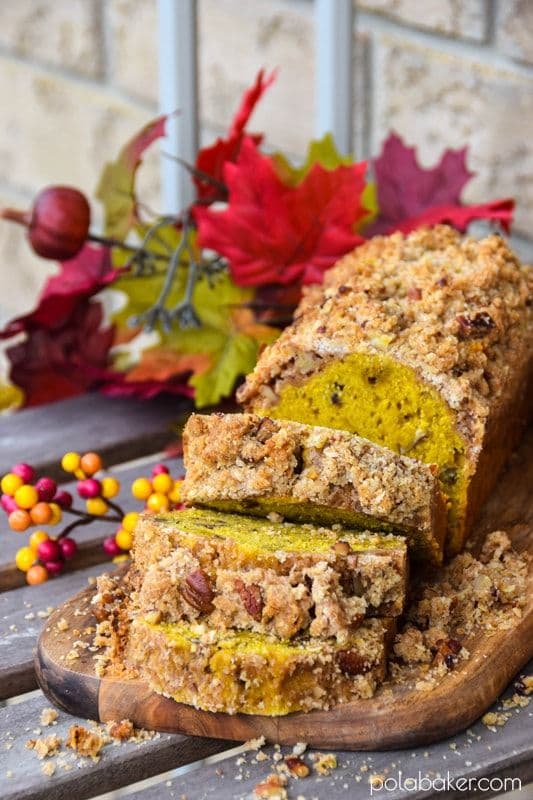 This soft and moist pumpkin bread is topped with a thick layer of crunchy and fragrant pecan streusel.