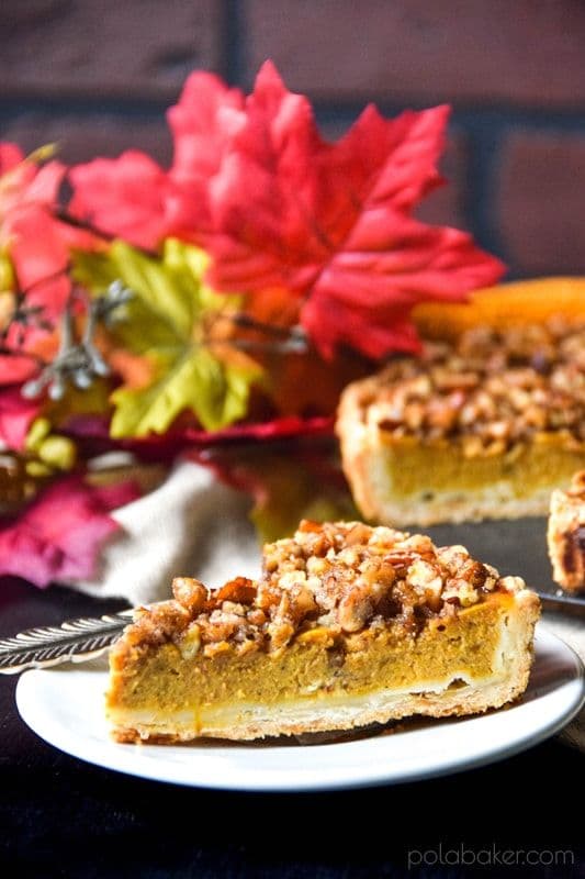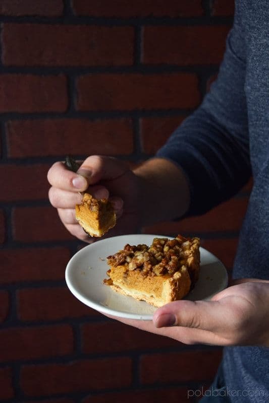 Smooth, perfectly spiced, almost mousse-like filling encased in a flaky buttery crust and topped with crispy and fragrant pecan praline.